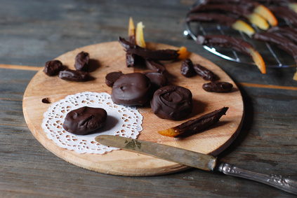 ドライフルーツのチョコがけ クーベルチュール(コーティング用のチョコレート)を用意し、湯煎して溶かします。溶けたチョコレートにお好みのドライフルーツをディップしてクッキングシートなどに並べ冷蔵庫で冷やして完成。チョコレートの風味とドライフルーツの香りと酸味がマッチしておいしいです。チョコレートのつけすぎに注意しましょう!